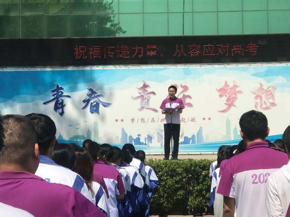 高二年级学生会主席于文恒代表非毕业班同学向高三同学送上祝福,愿学长们执笔为剑,心怀山海;从容落笔,不负韶华!诚挚的祝福点燃全场,更激荡起高三学子内心的澎湃力量。